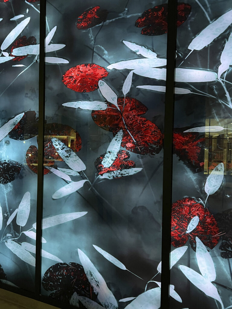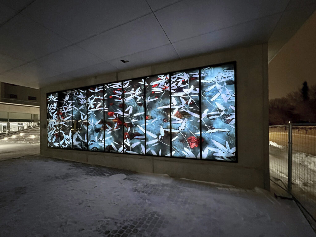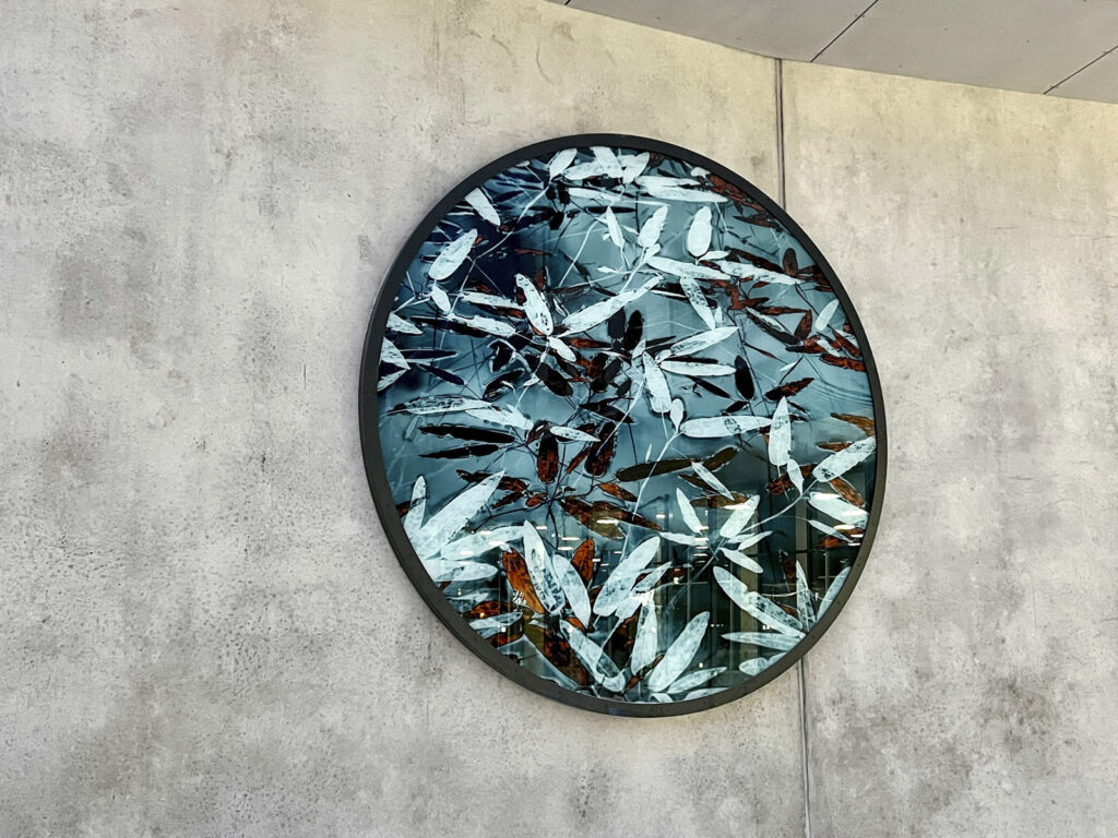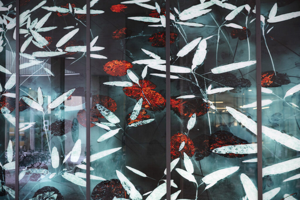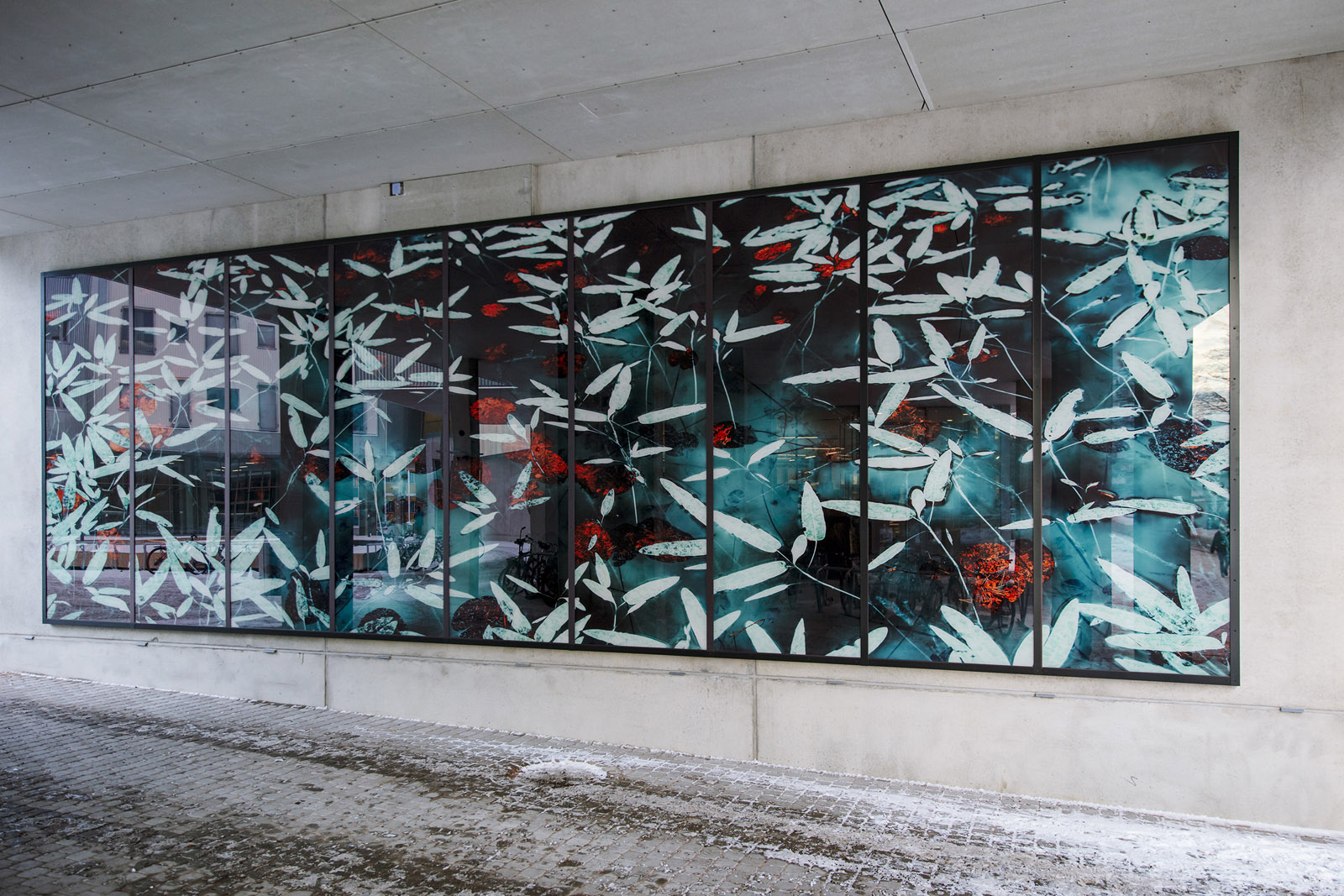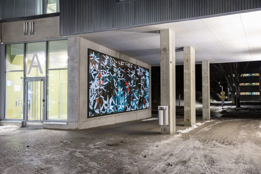 Teos on kerroksellinen lasilevyille painettu valokuva, jonka takana on videolla ohjattava led-valoverkko. Rakennuksen arkkitehtuuri ja sille varattu tila ovat inspiroineet teoksen vesi- ja lummeteemaa. Iltaisin syttyvä video-ohjattu led-valoverkko tuo taideteokseen uusia kerroksia, kun vedenpinnan väreily, taivaan heijastukset ja vedenalainen maailma tulevat esiin.